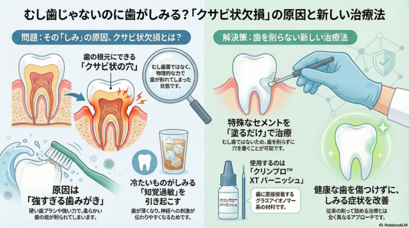 今回は、この歯の根元にできる穴の正体と、歯を削らずに治す当院の治療法についてお話しします。